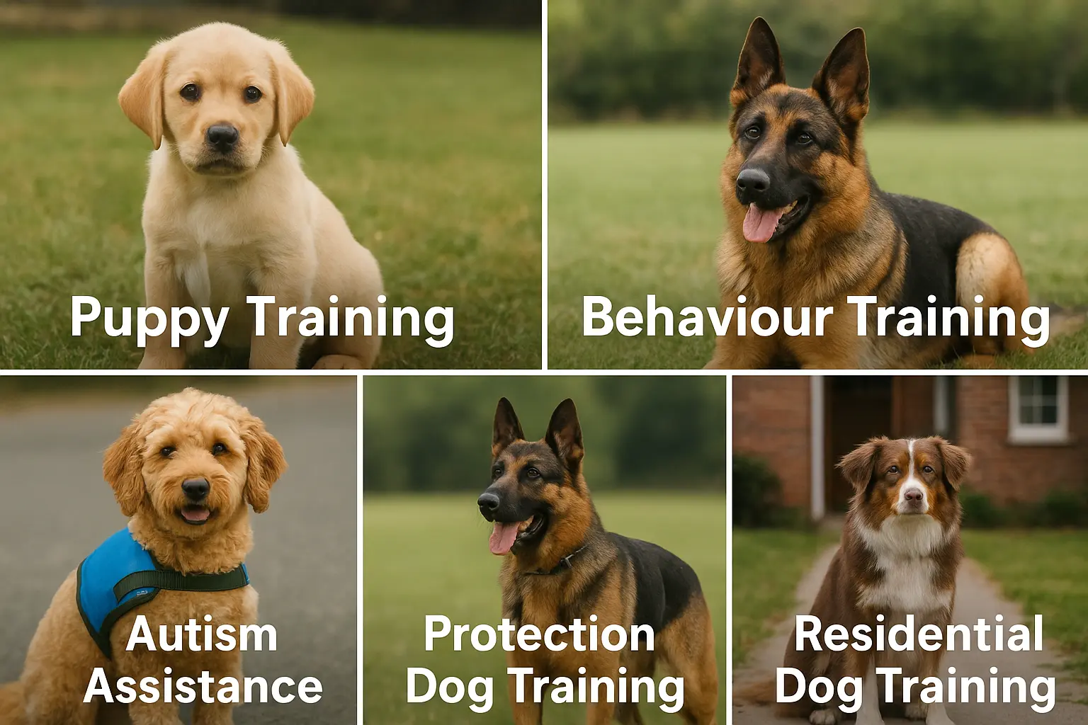 Intensive residential training improves obedience, behaviour correction, manners and confidence. In-home sessions allow practical guidance in the environment where behaviours occur. Programmes range from two to six weeks with a structured handover to owners.